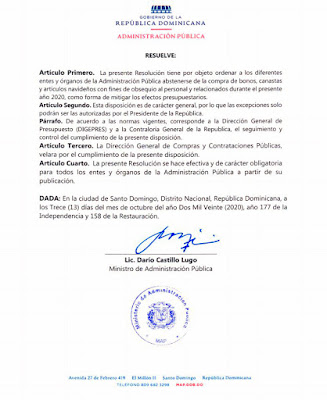 SANTO DOMINGO, República Dominicana. - El Ministerio de Administración Pública (MAP) ordenó a las diferentes instituciones públicas que se abstengan de realizar procesos de compras por concepto de bonos navideños, canastas y artículos con fines de obsequios al personal y relacionados para el año 2020.